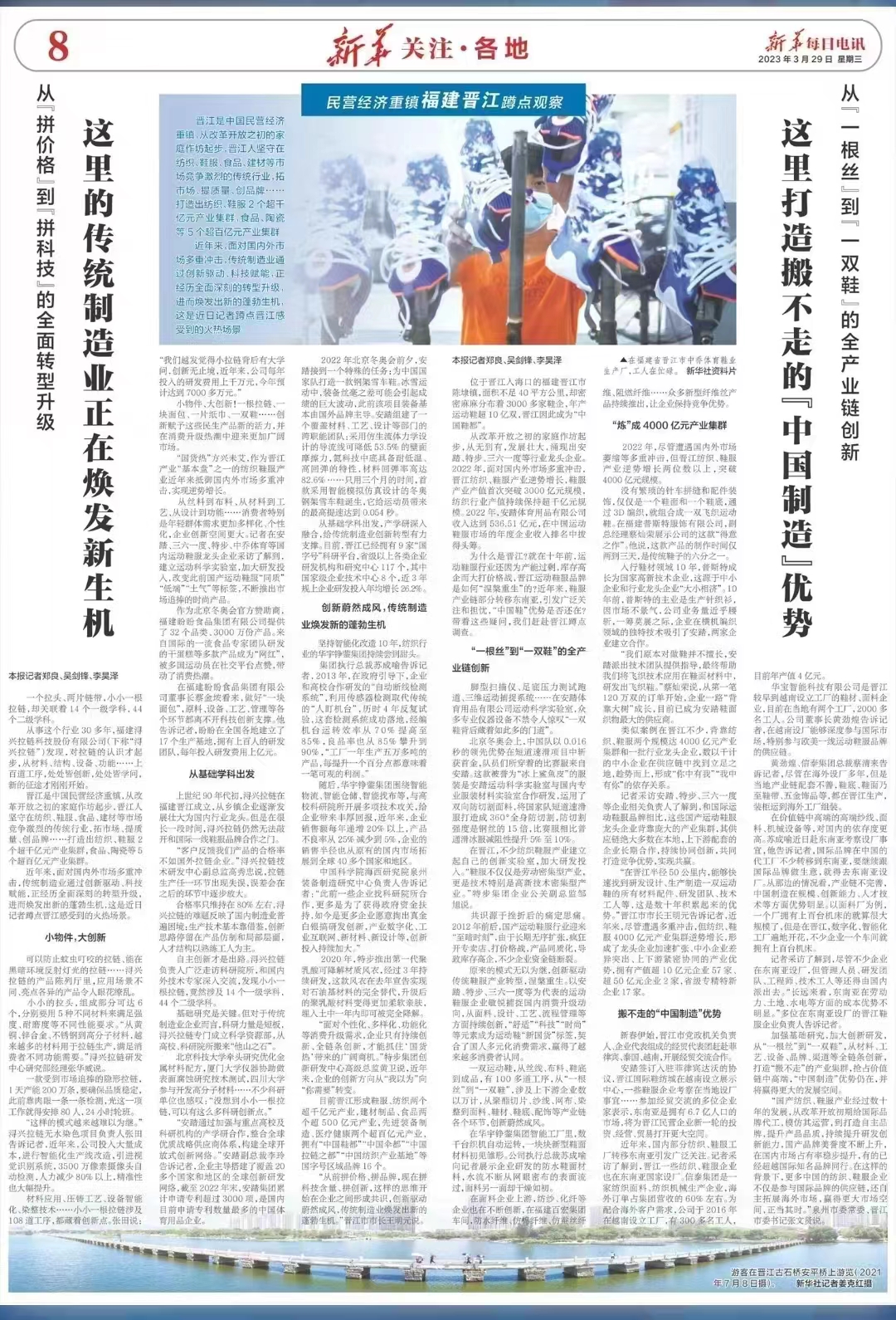 2023年3月29日,新華每日電訊蹲點觀察民營經濟重鎮福建晉江,整版報道民營經濟新氣象。其中《這里的傳統制造業正在煥發新生機》,報道中大篇幅展現SBS...